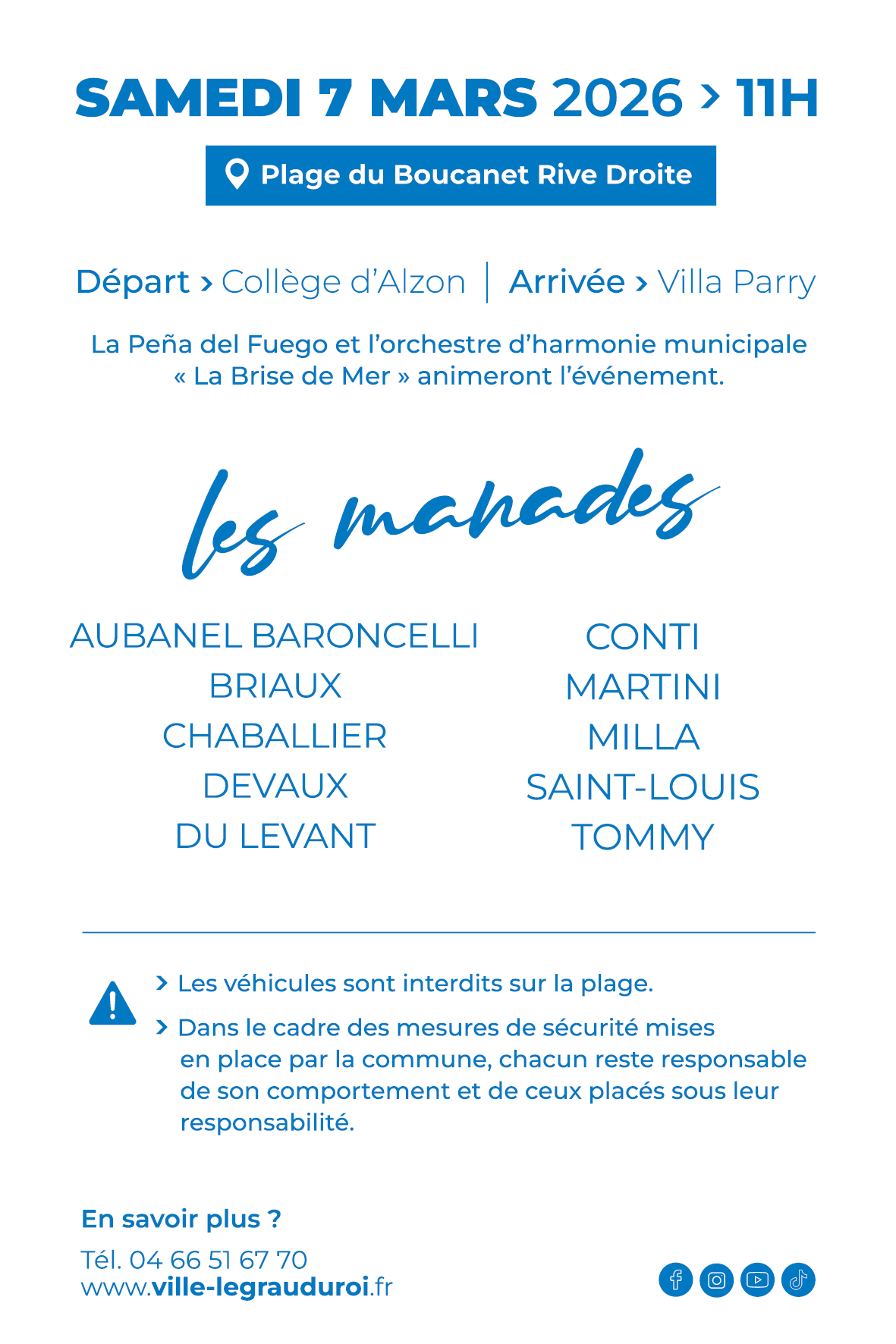 La 29e édition de l’Abrivado des plages se tiendra samedi 7 mars 2026 sur la plage du Boucanet, au Grau du Roi. À 9h30, Vincent Ribera, le directeur des Arènes municipales accompagné des manadiers présentera le programme de la saison taurine dans les jardins de la Villa Parry. À 11 heures, départ à hauteur du collège d’Alzon, arrivée à la Villa Parry.