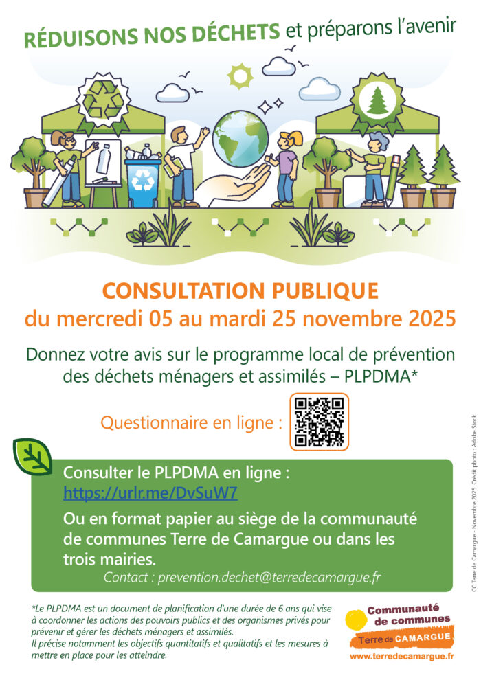 Terre de Camargue élabore son programme local de prévention des déchets ménagers et assimilés (PLPDMA) pour la période 2025- 2031. Du mercredi 5 au mardi 25 novembre 2025, une concertation publique est organisée afin de recueillir les remarques et suggestions des habitants du territoire sur ce projet.