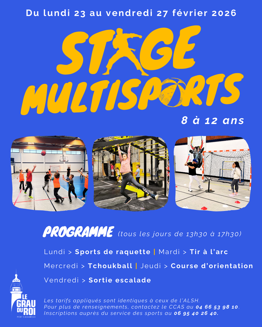 Pour les vacances d'hiver 2026, le service des sports de la ville organise un stage multisports du 23 au 27 février au Palais des sports, destiné aux enfants âgés de 8 à 12 ans. Au programme : sports de raquette (pickleball, tennis de table, badminton), tir à l'arc, tchoukball, course d'orientation, sortie escalade.
